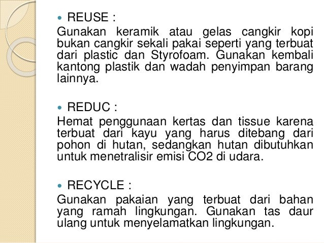 Contoh perilaku ramah lingkungan widianingtias hidayati. Mengumpulkan botol dan gelas plastik untuk dikirim ke financial institution sampah atau lembaga sosial yang mengelola limbah plastik. Menggunakan kantung plastik bekas untuk wadah barangbarang atau alatalat. Memberi contoh langsung perilaku ramah lingkungan kepada siswa di. Bioplastik, plastik ramah lingkungan dari tandan kosong. Plastik ramah lingkungan. Salah satu upaya yang dianggap menjanjikan, adalah pengembangan bioplastik, yaitu plastik ramah lingkungan yang dibuat dari bahan terbarukan dan bisa terurai secara biologi di alam. Bioplastik akan hancur dengan sendirinya di alam dalam jangka waktu tertentu, sehingga tidak akan menumpuk dan mencemari lingkungan. Kantong plastik ramah lingkungan yang tidak ramah. Plastik yang digadangdagangkan ramah lingkungan itu justru memiliki efek buruk terhadap lingkungan. Setelah membaca artikel ini saya yakin anda pasti akan setuju dengan weight-reduction plan kantong plastik. Terutama kantong plastik sekali pakai yang bahkan umurnya tidak sampai 30 menit. Kemasan makanan dan minuman yang ramah lingkungan. Gelas plastik untuk kopi dingin maupun kopi panas yang sekarang ini digunakan oleh produsen kopi yang sudah dikenal hampir di seluruh dunia ini, kini menggunakan kemasan ramah lingkungan. Gelas plastik tersebut terbuat dari bahan polylactic acid (pla). Bioplastik, plastik ramah lingkungan dari tandan kosong. Plastik ramah lingkungan salah satu upaya yang dianggap menjanjikan, adalah pengembangan bioplastik, yaitu plastik ramah lingkungan yang dibuat dari. Bioplastik, plastik yang lebih ramah lingkungan berbagi. Minimum, dua hal inilah yang menjadi pendorong pencarian/penelitian bahan plastik yang ‘lebih ramah lingkungan’. Masalahmasalah tersebut bisa dihilangkan, atau paling tidak dikurangi. Maka lahirlah yang dinamakan ‘bioplastik‘. Dari namanya sendiri bioplastik berasal dari dua suku kata bio dan plastik. Bio artinya hidup.